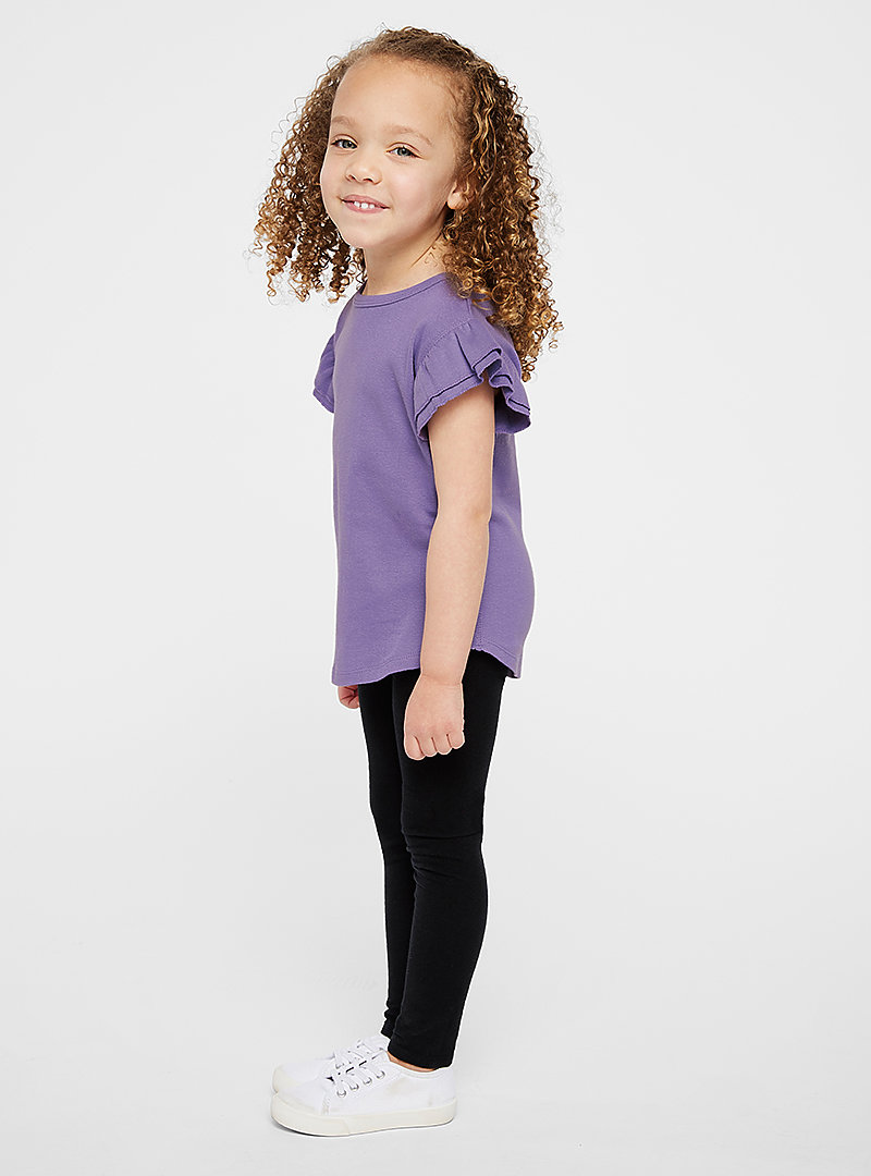Features: Double needle ribbed binding on collar and bottom hem • Double layered flutter sleeves with serged edges • Coverstitched armholes and side seams • CPSIA compliant tracking label in side seam • EasyTear™ label