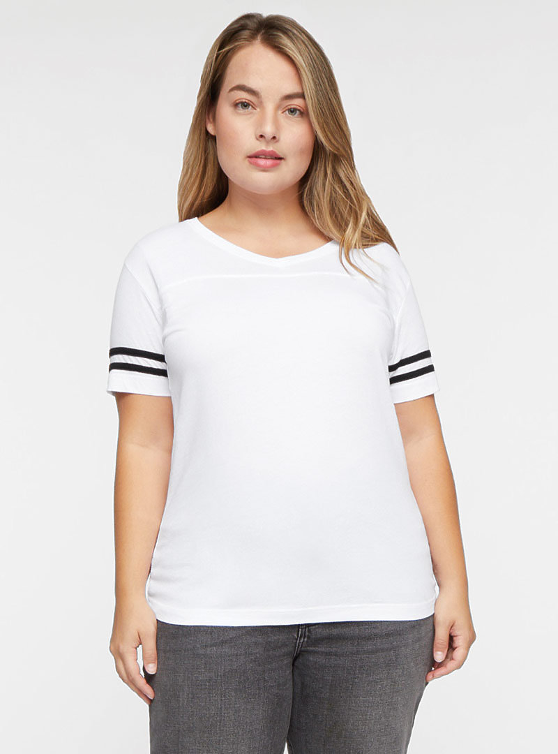 This football style t-shirt will have you feeling like you are part of the team on game day. Specially designed with stripes on the sleeves and a coverstitched yoke to give a sporty look with exceptional comfort.