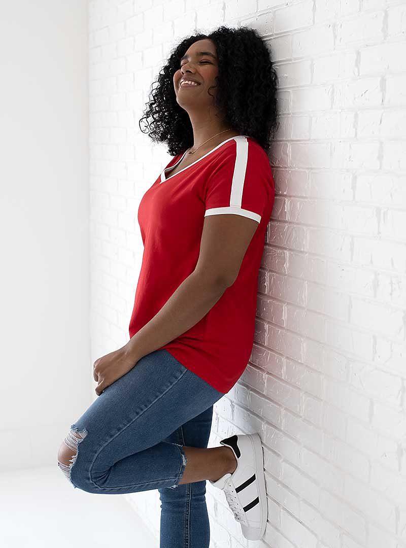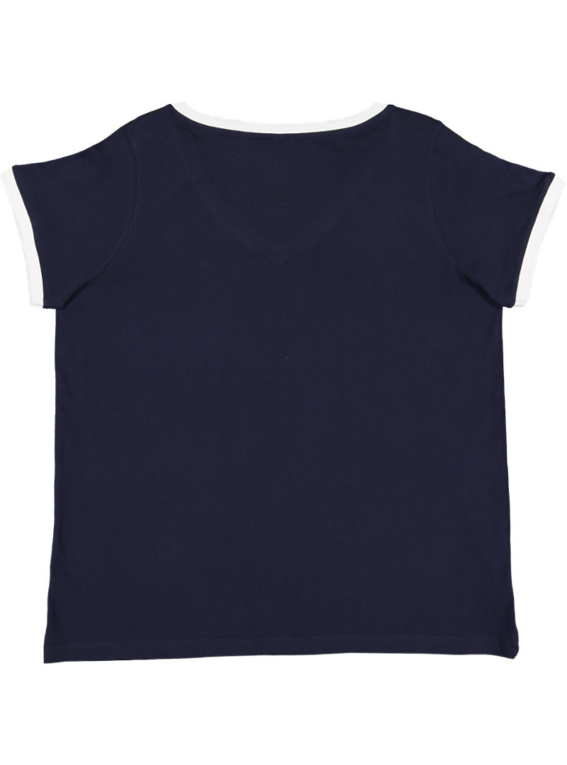 Live & Tell Ladies'' Curvy 100% Combed Ringspun Cotton Premium Jersey V-Neck Short Sleeve Retro Ringer Tee