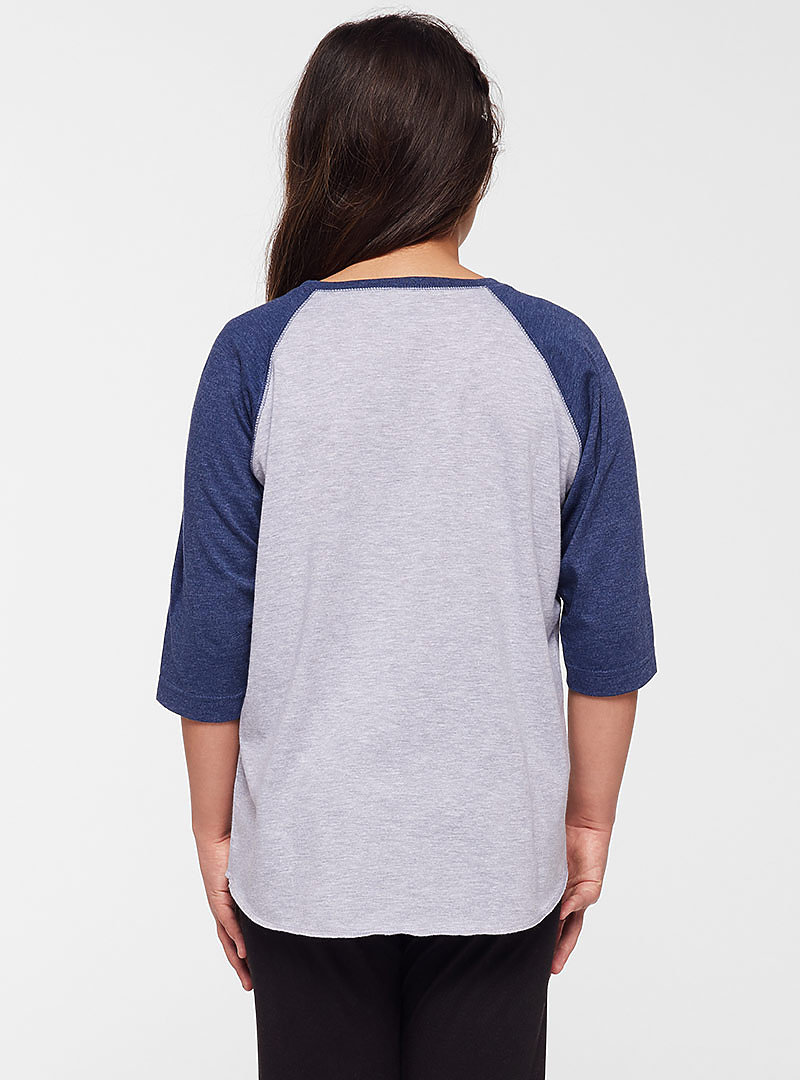 Features: Flatlock stitched contrast ribbed collar and raglan armholes • Contrast double needle hem raglan 3/4 sleeves • Raw serge shirt tail bottom hem • Side seam construction • EasyTear™ label